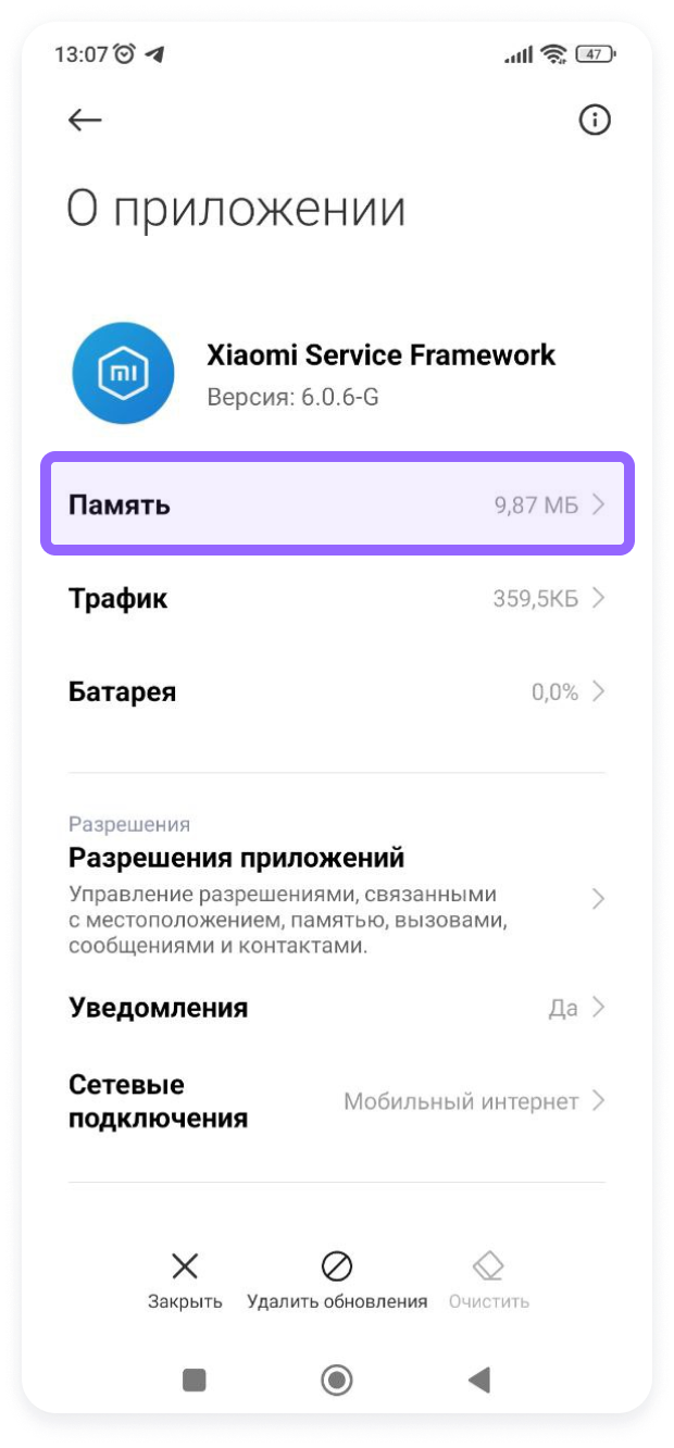 Xiaomi Service Framework и очистите в нем память и кэш;