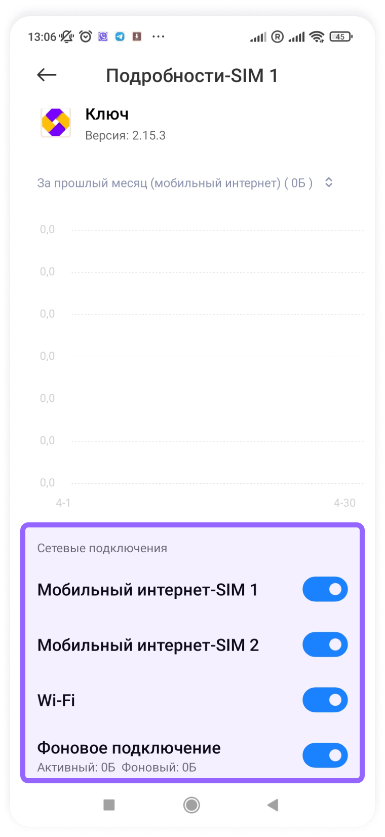 В разделе «Безопасность» перейдите в «Трафик», затем «Сетевые подключения». Проверьте, есть ли у приложения «Ключ» доступ к 3G и/или Wi-Fi.
