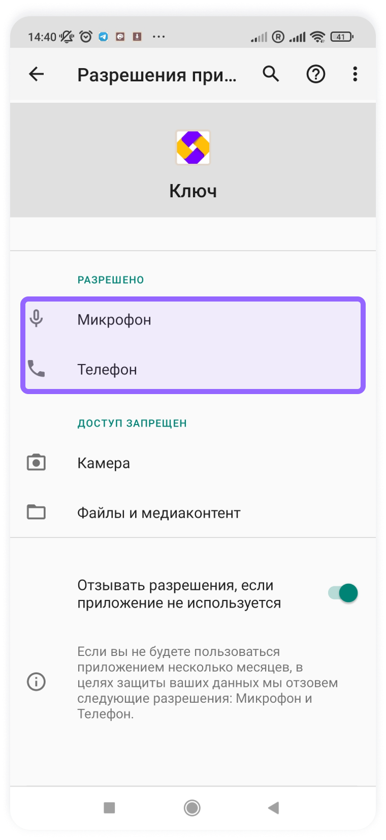 В настройках приложения выберите пункт «Разрешения приложений». Включите параметры «Микрофон» и «Телефон».
